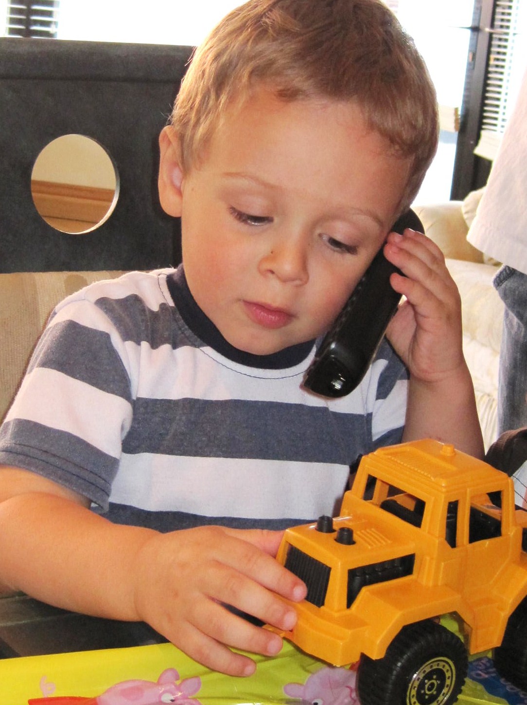 He got a few phone calls today. We could only hear his end. I heard him say the exact same thing during each of the conversations: "I'm 3 years old. Aaron's 4 years old. We're both big."